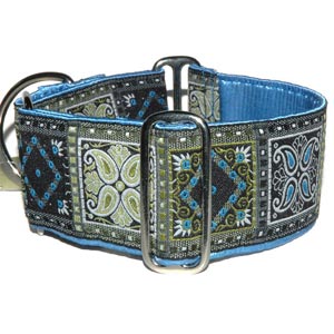 These brand new 2 inch wide jacquard ribbons are amazingly detailed. Lavishly woven with intricate details and vibrant shades of black, olive green, blue, and cream this Martingale Dog collar is sure to turn heads.