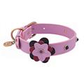 Pink leather dog collar with red and purple layered petals punctuated with a bezel set glass stone.