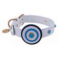 Designer white leather dog collar with circles & blue Cats Eye center stone. Genuine semi precious stone.